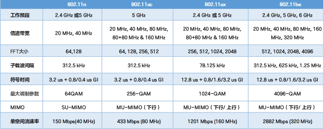 2、Wi-Fi 11n / ac / ax / be 特性对比