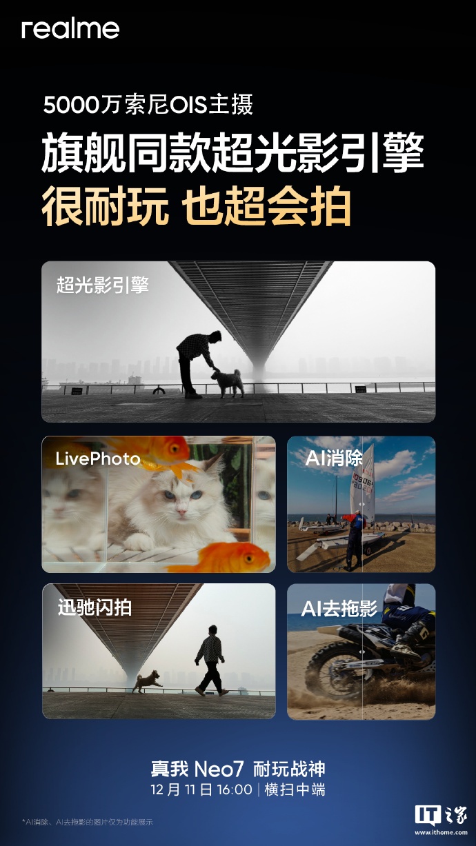 IT之家 12 月 7 日消息,realme 今日继续对真我 Neo7 手机预热,其搭载旗舰同款超光影引擎,5000 万索尼 OIS 主摄,支持 Live 实况照片、迅驰闪拍模式、AI 消除、AI 去拖影等功能。
