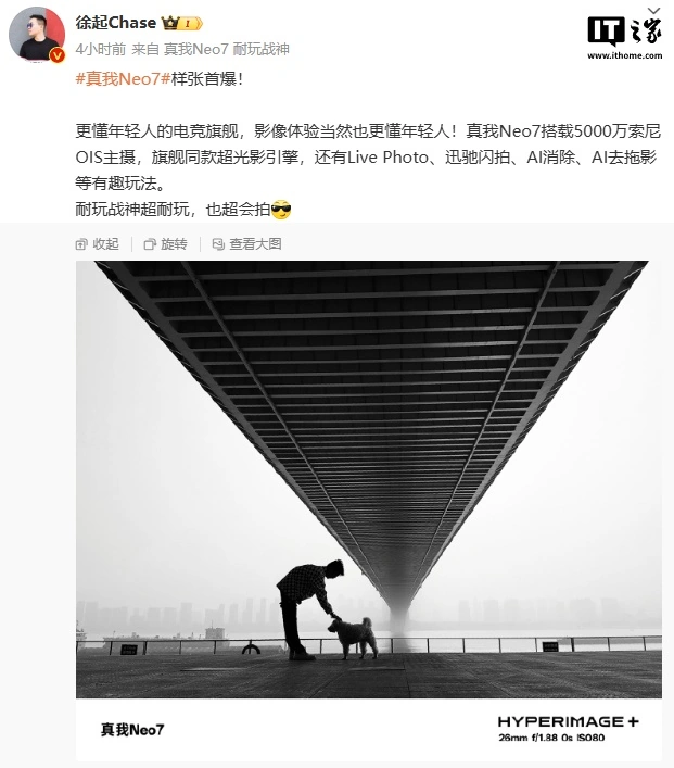IT之家 12 月 7 日消息,realme 副总裁、全球营销总裁、中国区总裁徐起今日首次分享真我 Neo7 手机拍摄样张,新机搭载 5000 万索尼 OIS 主摄,旗舰同款超光影引擎,还有 Live Photo、迅驰闪拍、AI 消除、AI 去拖影等玩法。
