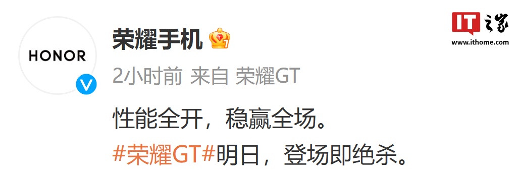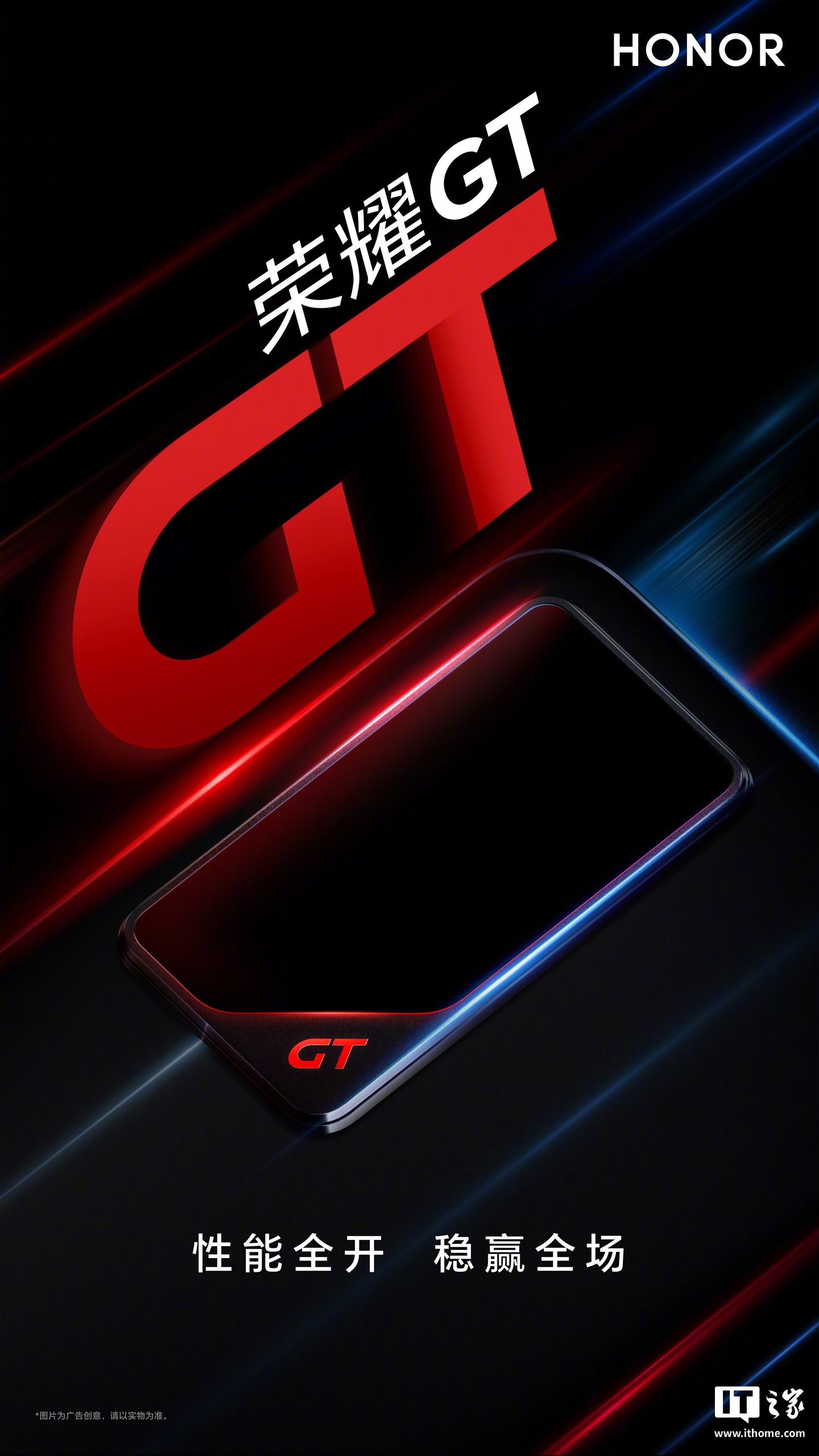 IT之家 12 月 8 日消息,荣耀手机官方今日公布了荣耀 GT 手机的预热海报,口号“性能全开,稳赢全场”。官方宣称“荣耀 GT 明日,登场即绝杀”。