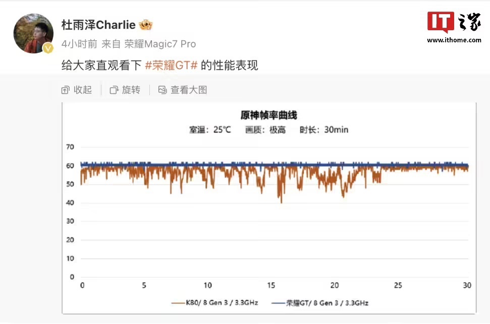 荣耀 GT 系列产品经理 @杜雨泽Charlie 曾分享新机帧率图。图片显示,荣耀 GT 手机将搭载骁龙 8 Gen3 处理器。