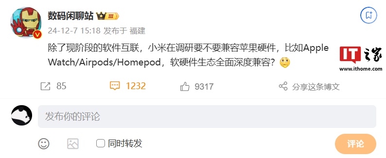 IT之家 12 月 8 日消息,博主 @数码闲聊站 昨日发文透露,小米在调研是否兼容苹果硬件,比如 Apple Watch、AirPods、HomePod 等,软硬件生态全面深度兼容。