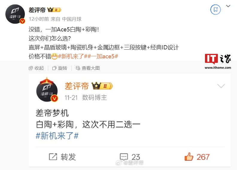 博主 @差评帝 今日发文爆料,一加 Ace 5 手机将采用“白陶 + 彩陶”设计(此处预计为白色陶瓷机身配色和彩色陶瓷机身配色)。该机特点还包括:直屏 + 晶盾玻璃 + 陶瓷机身 + 金属边框 + 三段按键 + 经典 ID 设计。