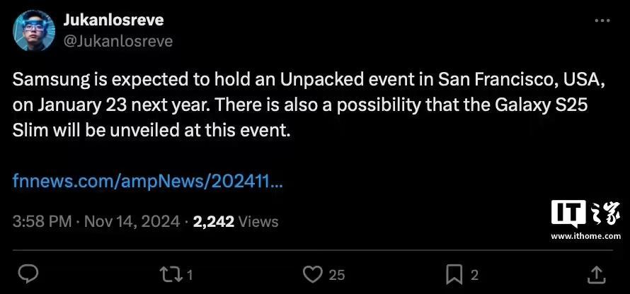 虽然三星尚未公布 Unpacked 发布会的具体时间,不过消息源 Jukanlosreve 透露,该发布会有望于 1 月 23 日在美国加州旧金山举行。