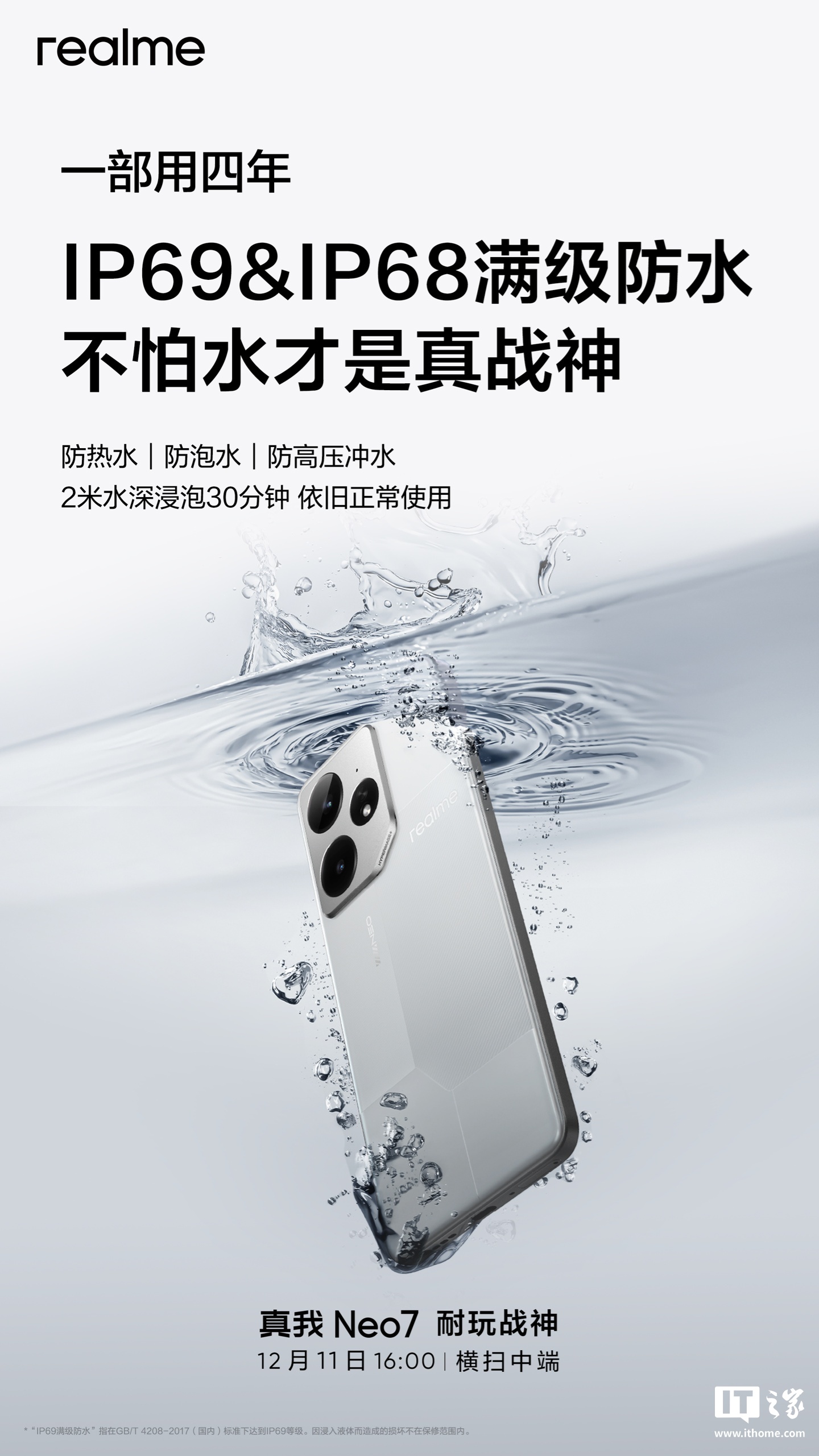 真我 Neo7 支持“IP69、IP68 满级防水”,防热水、防泡水、防高压冲水,官方称该机在 2 米水深浸泡 30 分钟依旧正常使用。