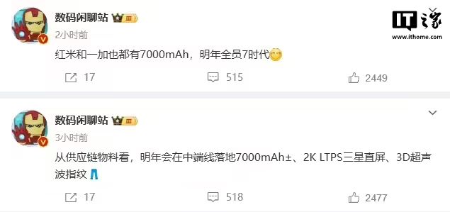 并且不只是旗舰机,中端机的电池容量亦一路疾驰,7000mAh 会在中端线落地。