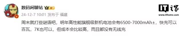 后续,手机电池的容量会进一步提升,微博博主曾于 12 月 7 日爆料称:明年高性能旗舰级新机电池会有 6500-7000mAh±。