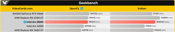 在Geekbench的OpenCL实际测试中,锐炫B580得分为98343分,在Vulkan测试中得分为103445分,这一成绩使其在RTX 4060和RX 7600 XT之间。