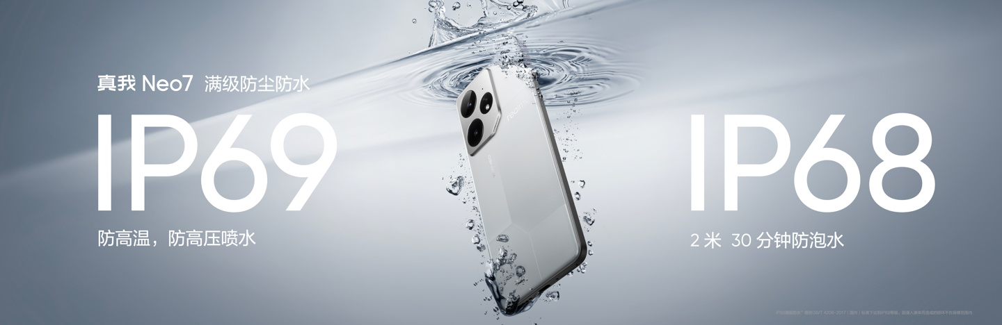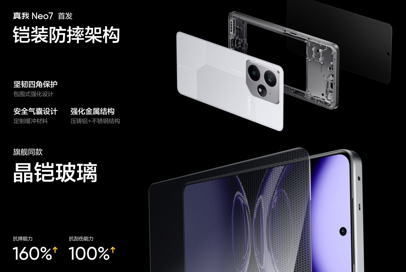 真我 Neo7 搭载 IP69+IP68 满级防水,宣称“防热水、防泡水、防高压冲水”;首发铠装防摔架构,强化金属结构;配备旗舰同款晶铠玻璃,号称“抗摔能力提升 160%,抗刮伤提升 100%”。该机首销赠四年电池保,4 年内电池容量低于 80%,即可免费换新一次。