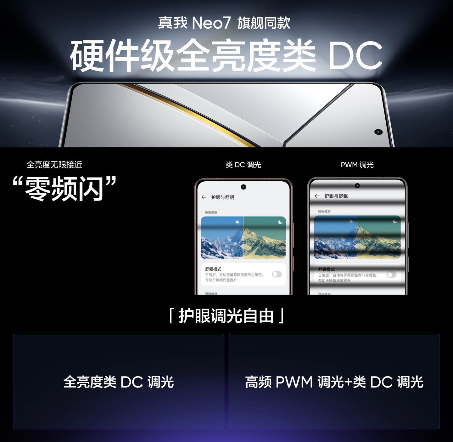 新机还支持硬件级全亮度类 DC 调光,宣称全亮度 1 Pulse 调光、体验近乎“0 频闪”。另外,该机还支持高频 PWM 调光、绿野 AI 护眼、类纸显示、自适应环境色温、舒眠模式。真我官方还开放全亮度 DC 调光和高频 PWM 调光 + 类 DC 调光供用户自由选择
