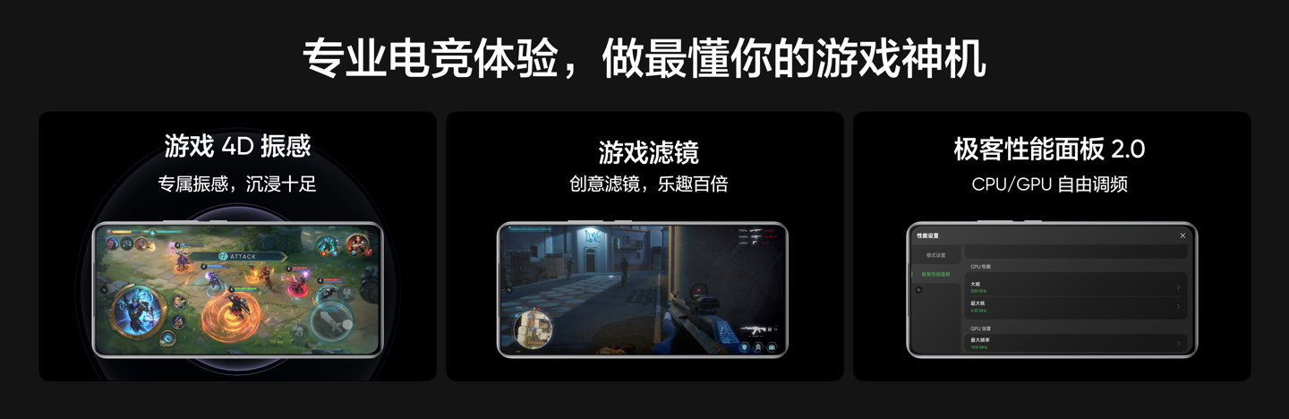 新机搭载联发科天玑 9300+ 处理器(CPU 架构全大核、台积电 4nm 工艺、CPU 最高主频 3.4GHz),支持芯片级超帧;内置 GT 性能引擎,宣称“高帧久、重载稳、功耗低”;拥有 7700mm² 目前行业最大面积单体 VC,支持苍穹通信系统 2.0。