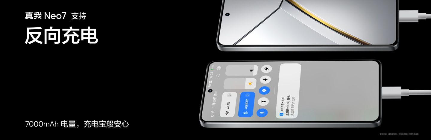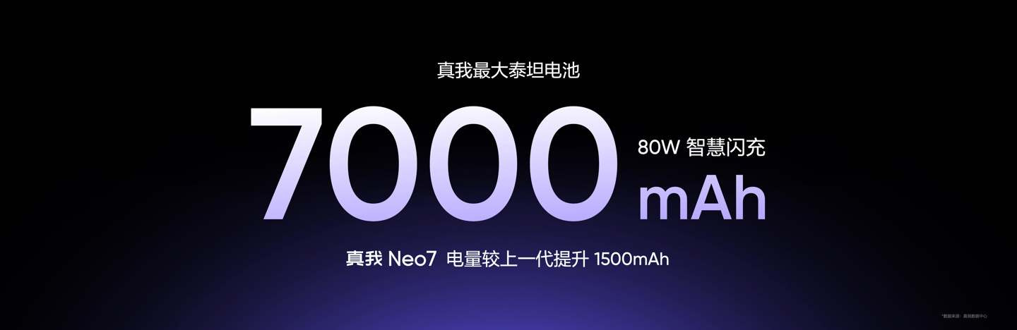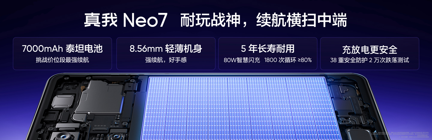 realme 真我 Neo7 手机联合宁德新能源首发 7000mAh 容量泰坦电池,支持 80W 智慧闪充(1800 次循环≥80%);新机的电池能量密度 800Wh / L,内置高性能电解液、采用折叠电路板设计 + 高透极片工艺。真我 Neo7 整机的机身厚度约 8.56mm,对比上代搭载 5500mAh 电池的真我 GT Neo6 厚度(8.65mm)有所减少,同时支持反向充电。