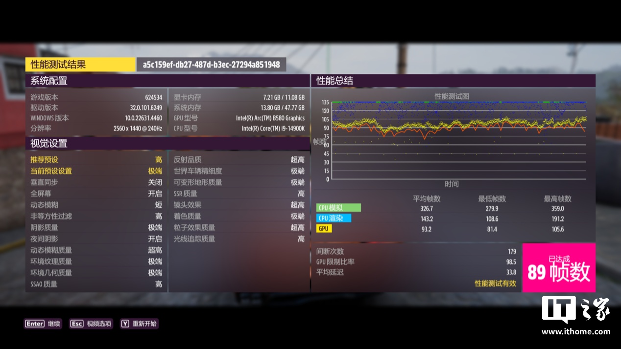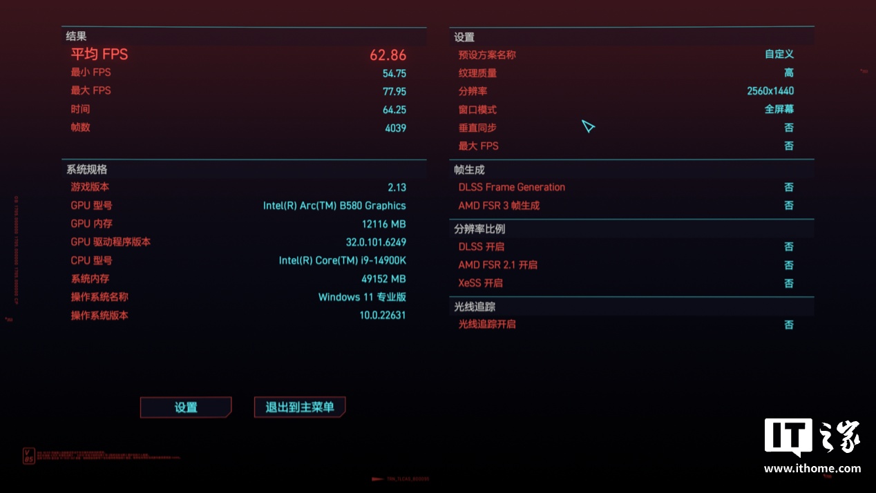 庆幸的是在不开启全景光线追踪的情况下,以 2K + 高画质 + 35% XeSS 超采样清晰度运行自带基准测试,游戏平均帧数达到了 63 帧,流畅游玩不是问题。