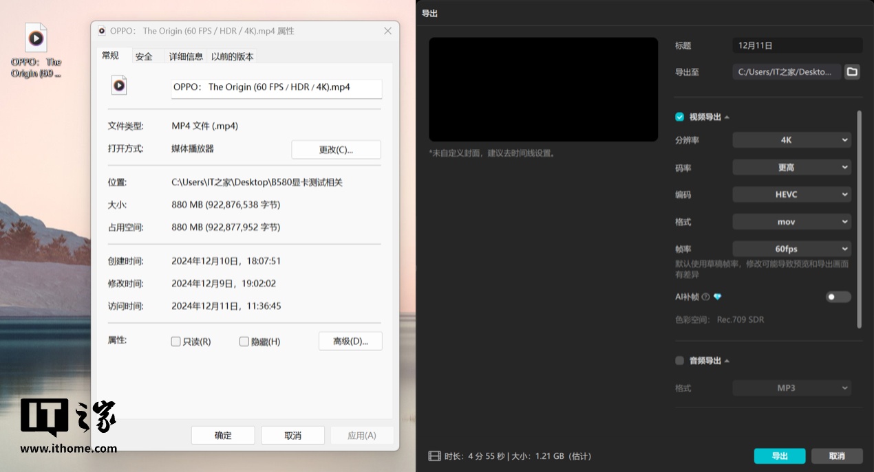 而在视频导出速度上,我们将一段时长 4 分 55 秒的 4K / 60FPS / HDR 视频导入剪映专业版中进行导出,导出时改为 HEVC 编码格式和 mov 文件格式。最终导出时间仅花费了 1 分 20 秒完成,导出视频的体积大小为 1.2GB 左右,效率同样出色。