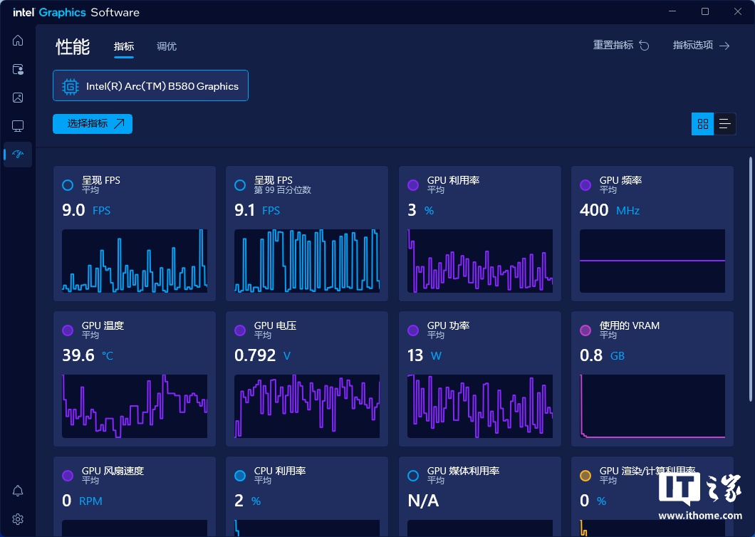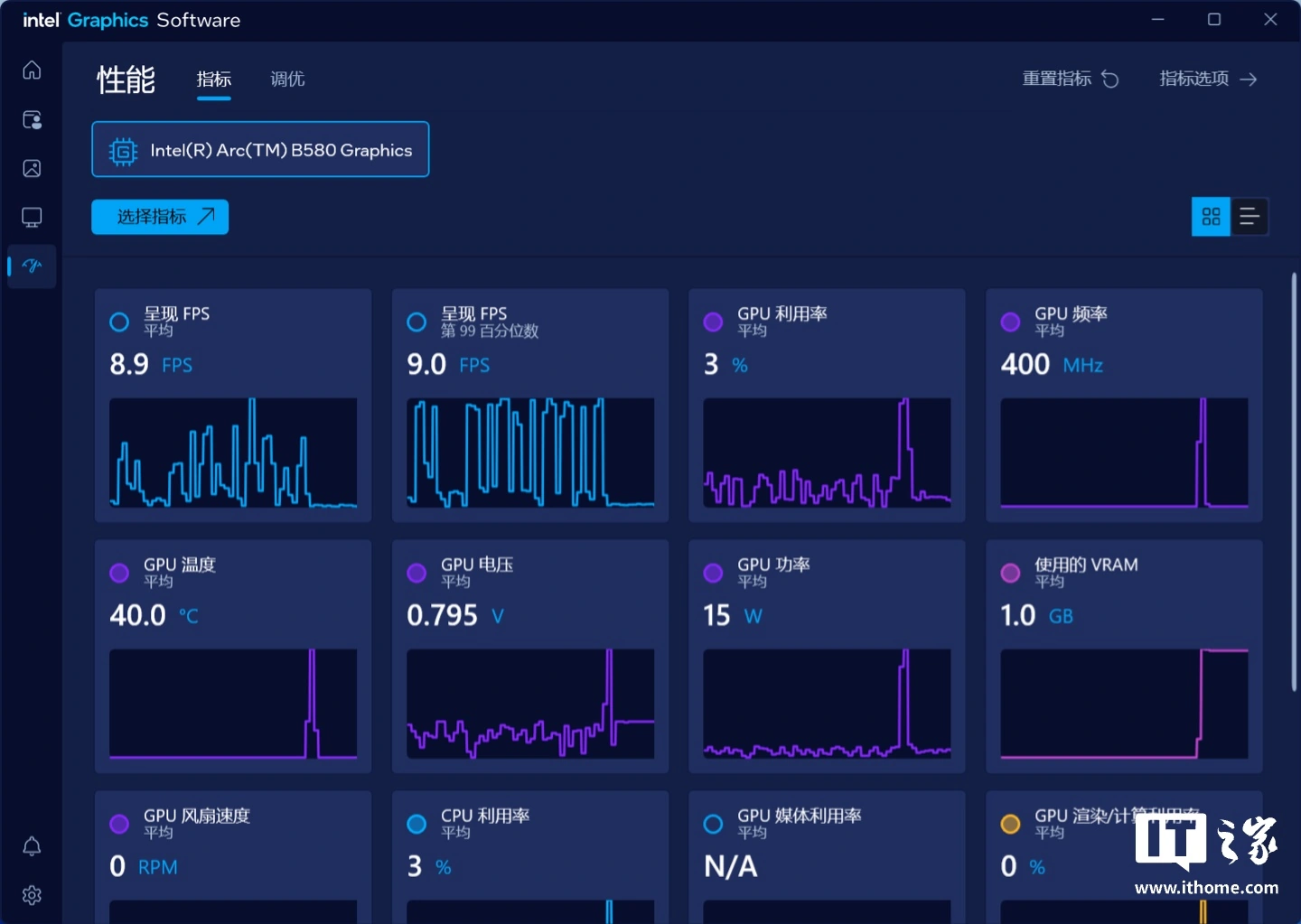 最后是性能选项卡,它拥有指标和调优两个子标签。其中指标部分可查看详细的 GPU 性能实施监测信息,类似 Windows 任务管理器的性能标签卡效果,用户可通过它实时了解显卡运行状态,每个方框都给到了具体数据和实时波形图,查看方便,比如前面提到的显卡待机功耗。