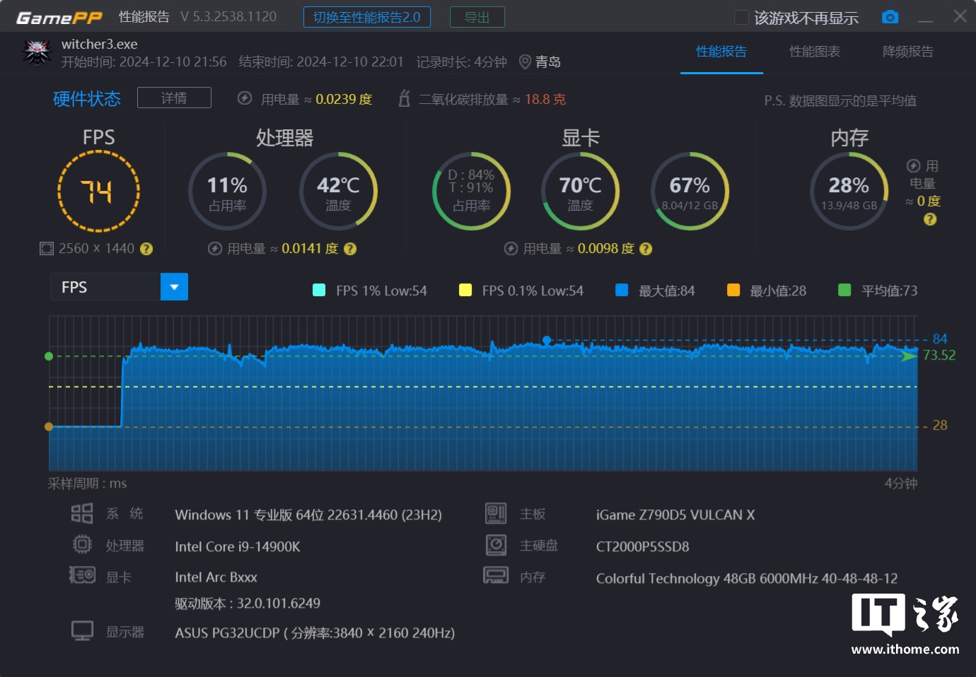 在 2K + 最高画质 + XeSS 性能下,游戏的平均帧数涨到 74 帧,1% Low 帧为 54 帧;