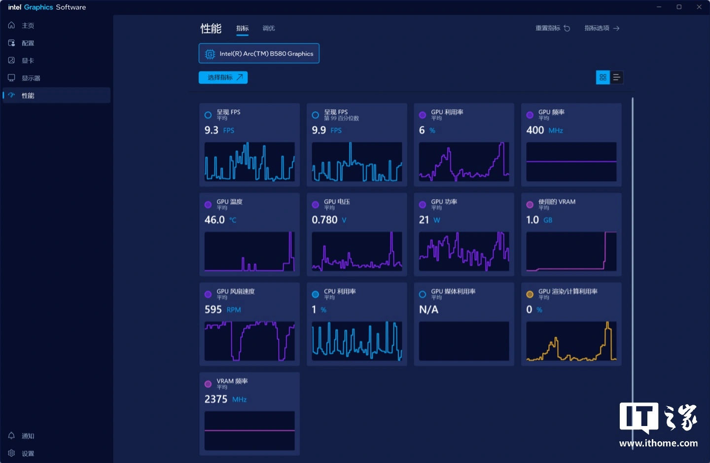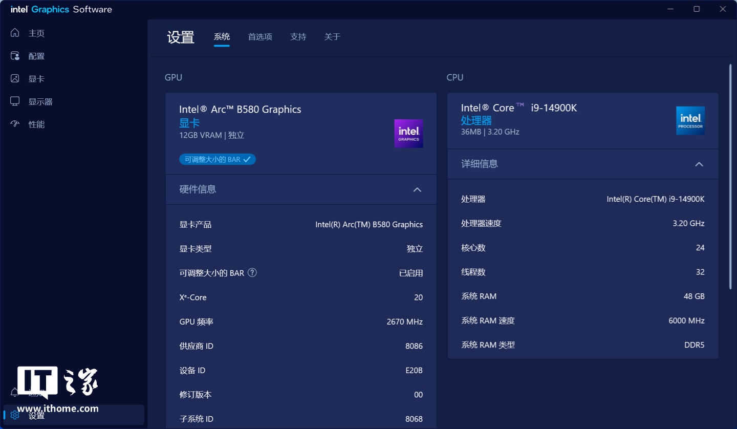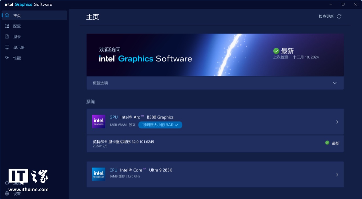 最后我们再看一看 intel Arc B 系列显卡带来的全新驱动软件 intel Graphics Software。软件整体采用了 A 卡标志性的深蓝 + 黑色主题色调,UI 视觉上经过了全新设计,软件主页可以看到当前 PC 上对应的 GPU 型号、Intel CPU 型号以及 GPU 驱动版本号等基础信息,用户可通过右上角的检查更新确认是否为最新驱动版本。