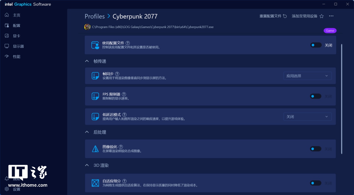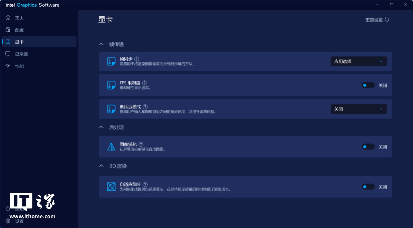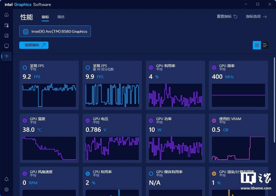 最后我们再看一看 intel Arc B 系列显卡带来的全新驱动软件 intel Graphics Software。软件整体采用了 A 卡标志性的深蓝 + 黑色主题色调,UI 视觉上经过了全新设计,软件主页可以看到当前 PC 上对应的 GPU 型号、Intel CPU 型号以及 GPU 驱动版本号等基础信息,用户可通过右上角的检查更新确认是否为最新驱动版本。