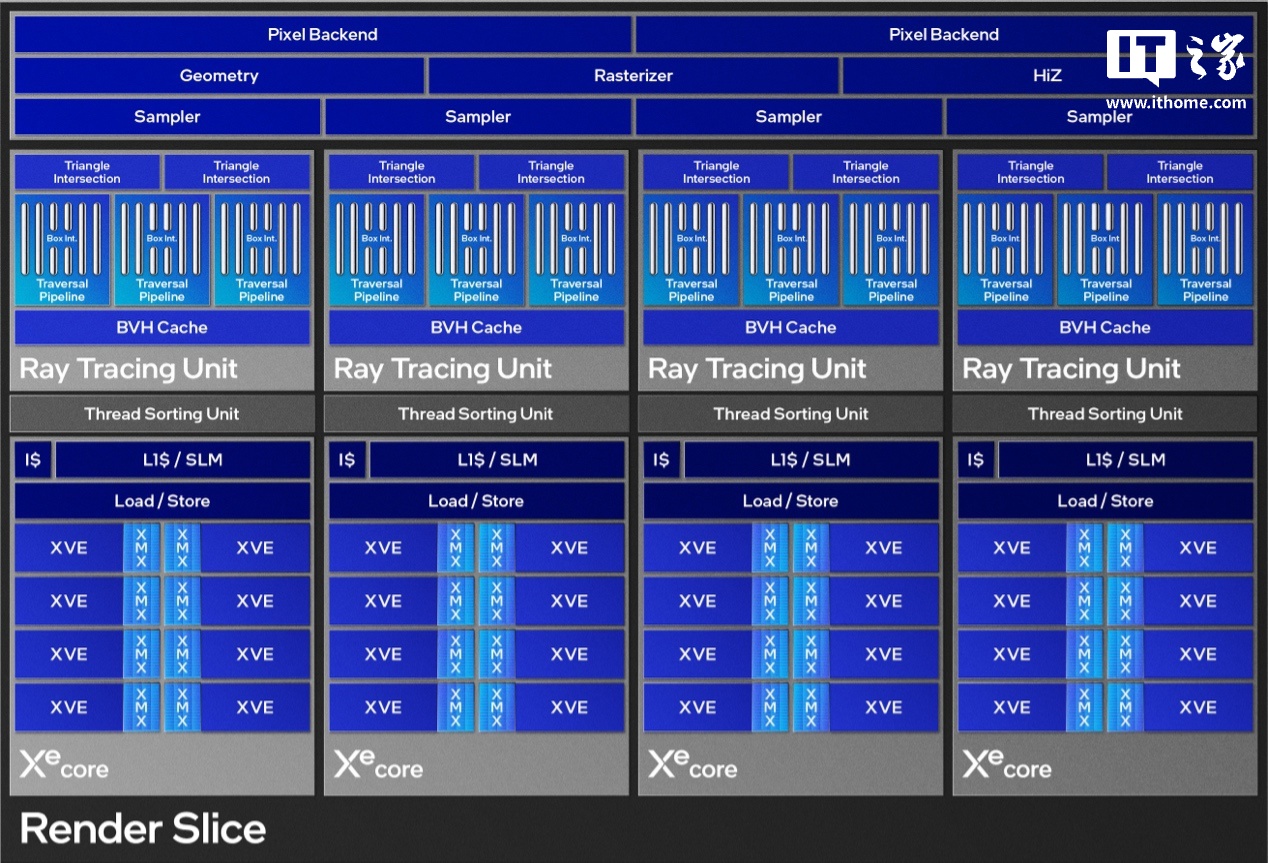 如上图所示,整个 BMG-G21 封装芯片中,Xe 2 的渲染切片有 5 组,每组 Xe 渲染切片中都包含 4 个 Xe 核心和 4 个光追单元和 4 个采样器,也就是 20 个 Xe 核心和 20 个光追单元。每个 Xe 核心内包含 8 个 512 位的 Vector Engine(矢量引擎)与 8 个 2048 位的 Engine(XMX 引擎),256KB 的 L1 缓存,对 L1 缓存命中率提升作用巨大。与锐炫 A 系列显卡相比,每个 Xe 核心的性能提高了 70%,每瓦性能提高 50%。