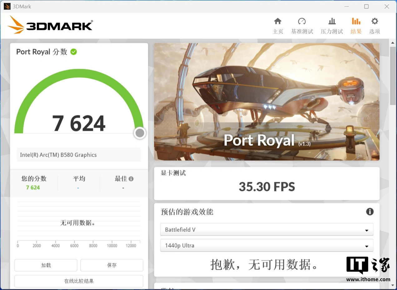 而在 Port Royal 测试中,intel Arc B580 公版显卡的综合分数为 7624 分,测试帧数表现为 35.3FPS;RTX 4060 的分数大概在 6200 分左右,测试帧数在 25 帧左右,前者相比后者提升了了 20% 以上。