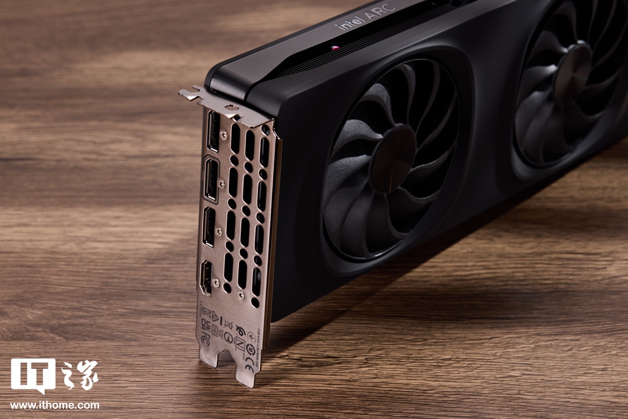 显卡正面外壳和背板延伸到侧边的部分几乎全面包裹着核心散热部件,显卡只露出一条扁长的开口,上半部分印有 intel ARC 字母标志。
