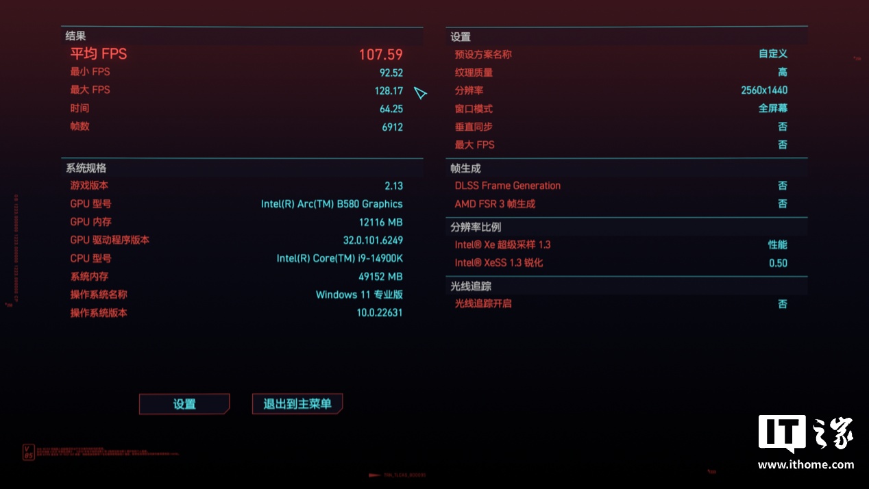 绕不开的光追 3A 游戏《赛博朋克:2077》直到现在依旧在完善游戏,我们测试的是支持了新版 XeSS 的 2.13 版本。这款游戏我们进行了 2 组对比测试: