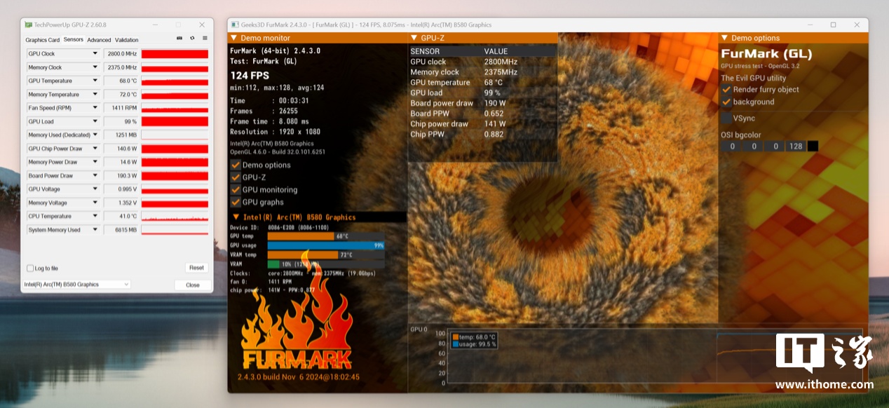 理论性能部分,我们将通过简单的烤机和跑分给大家提供一个性能表现上的大致参考。intel Arc B580 显卡的理论设计功耗为 190W,不过实际上这个 190W 并不仅仅指的是 GPU 核心功耗,还要加上显存功耗、风扇功耗和周边元器件功耗等。