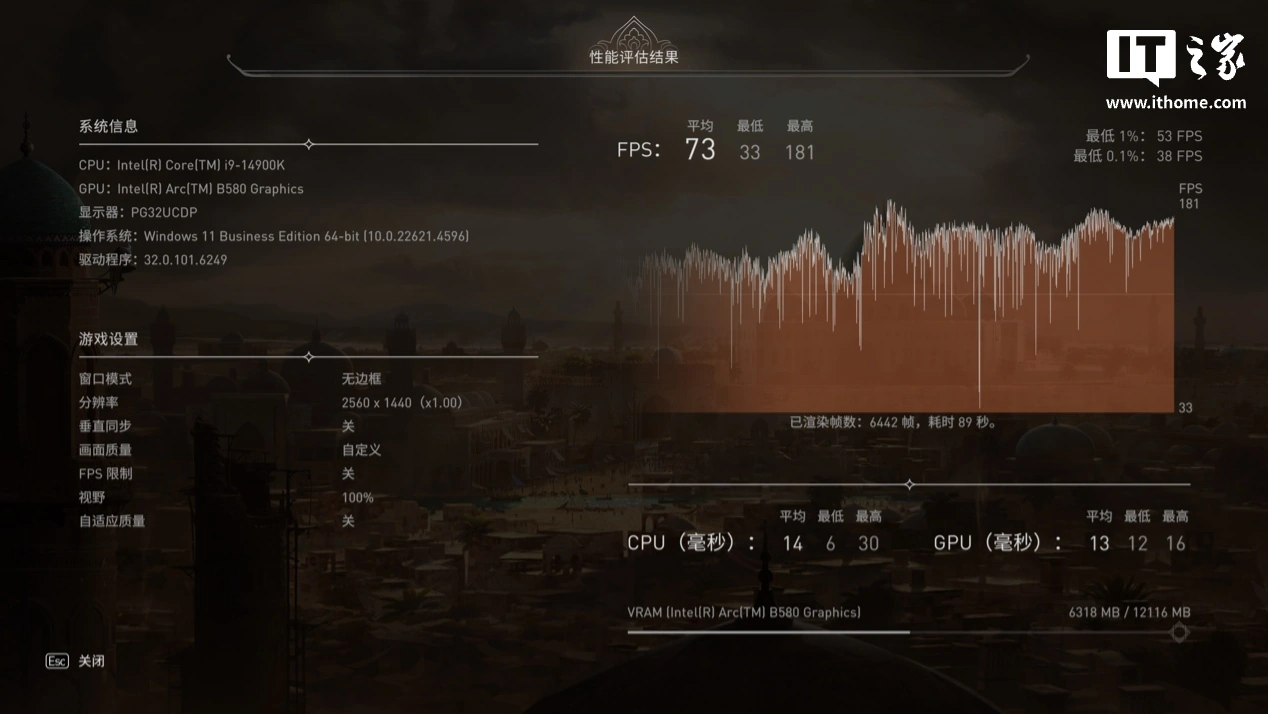 在 2K + 最高画质下,游戏平均帧数为 73 帧,1% Low 帧为 53 帧;