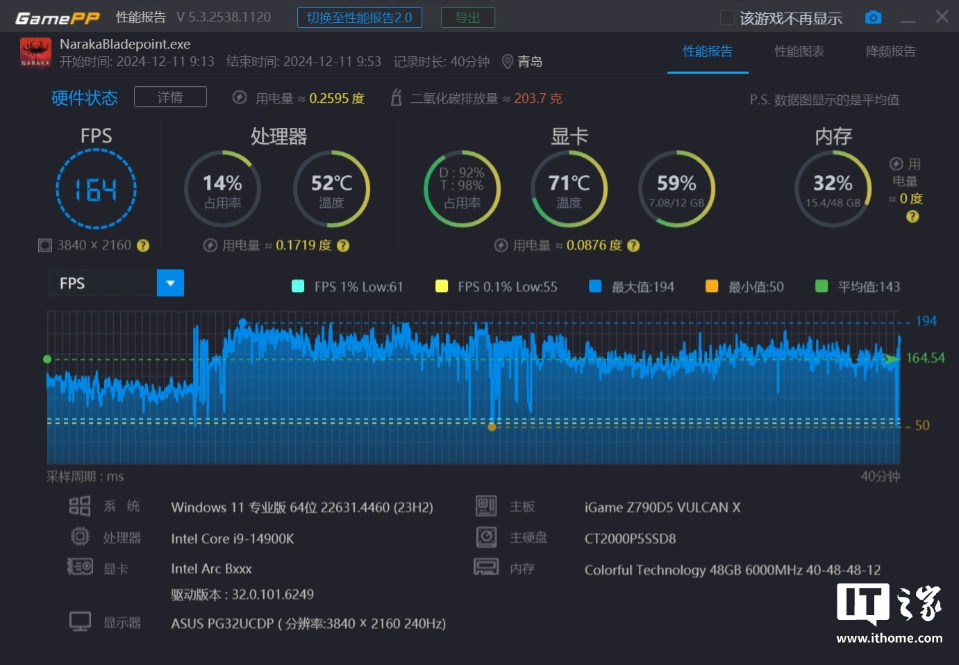 如此来看,这款游戏对 Inter Arc 显卡的适配非常友好,即使开启质量档 XeSS 都能做到游戏平均帧数几近翻倍,1% Low 帧翻倍的水平。