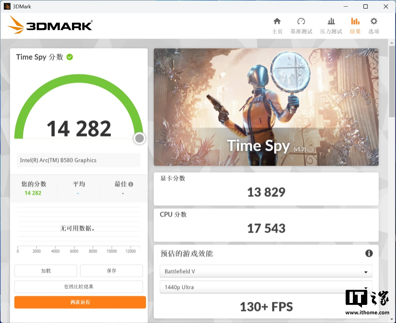 跑分方面,我们主要测试了基于 DX12 游戏的 Time Spy 和光追性能的 Port Royal 两项 3D Mark 项目。在 Time Spy 测试中,intel Arc B580 公版显卡拿到了 13829 分的显卡分数,这个分数显然要比 RTX 4060 要高一些,后者的公版显卡分数在 10800 分左右,提升幅度达到了 28%。