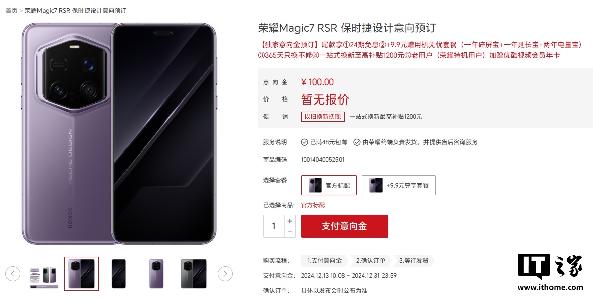IT之家 12 月 13 日消息,荣耀官网显示,荣耀Magic7 RSR 保时捷设计手机今日开启意向预订,意向金为 100 元,支付时间为 2024 年 12 月 13 日 10:08 ~ 2024 年 12 月 31 日 23:59。