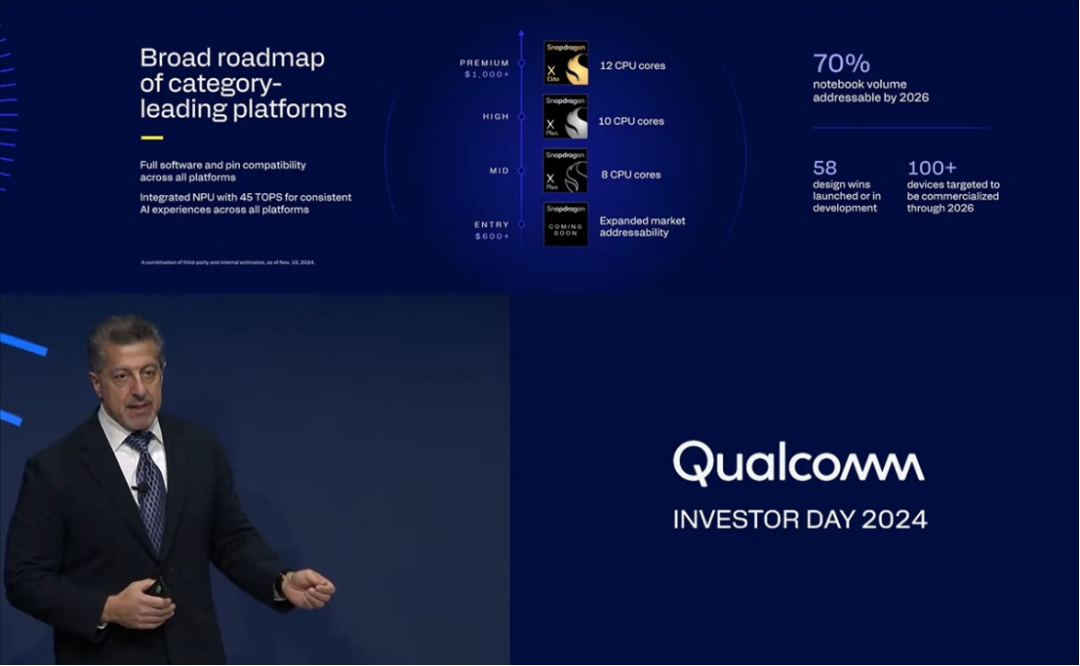 到2026年,高通的产品线将能够满足70%的Windows笔记本电脑市场。根据他们目前的预测,到2026年,将有超过100款基于骁龙X阵容的笔记本电脑上市。