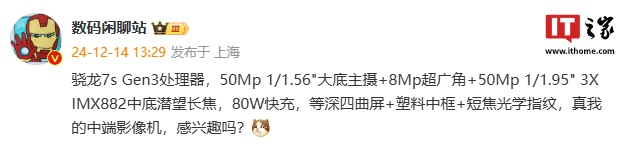 IT之家 12 月 14 日消息,博主 @数码闲聊站 今日曝光了一款 realme 真我中端影像机的主要参数,具体型号目前还未知。