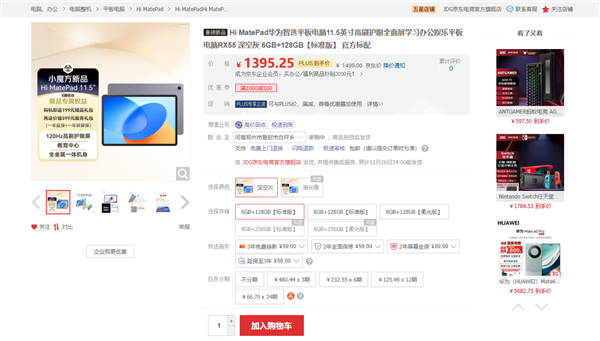 Hi MatePad 11.5英寸可选6GB+128GB、8GB+128GB、8GB+128GB柔光板三款配置,8GB+256GB版本暂时无货。
