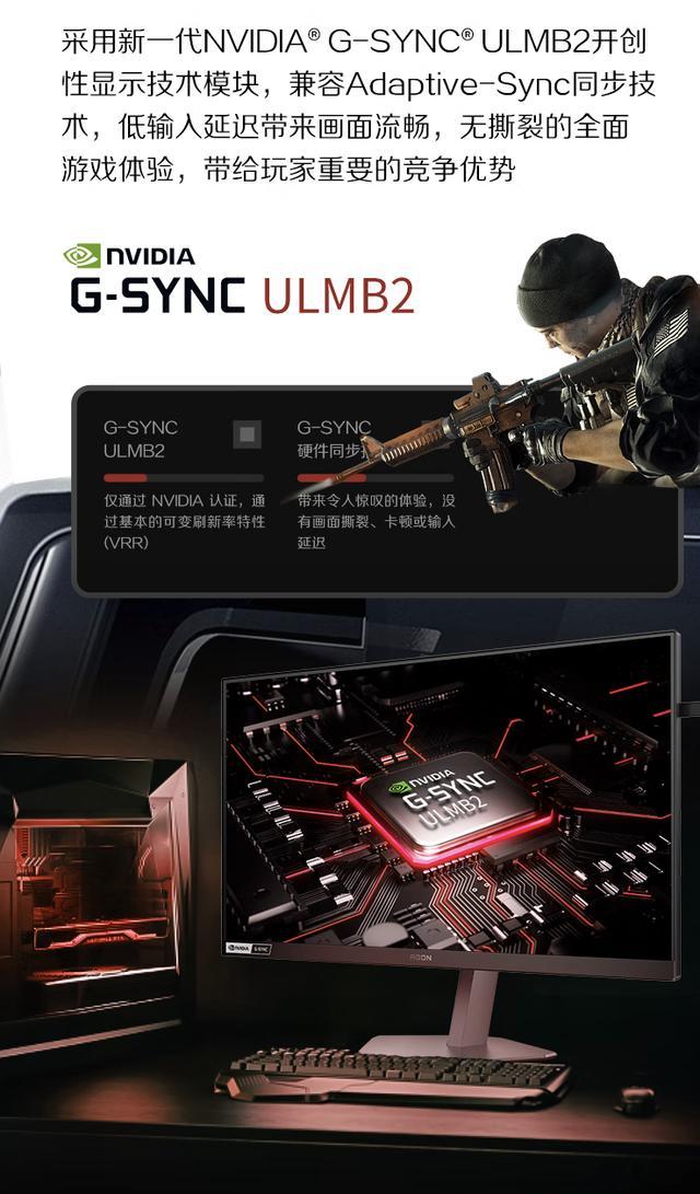 官方表示,这款显示器主打特色是配备了英伟达 G-SYNC ULMB 2(G-SYNC 超低动态模糊技术 2)显示模块,该技术号称能够实现超过 1000 Hz 的有效动态清晰度,让竞技游戏玩家很大程度上消除动态模糊。