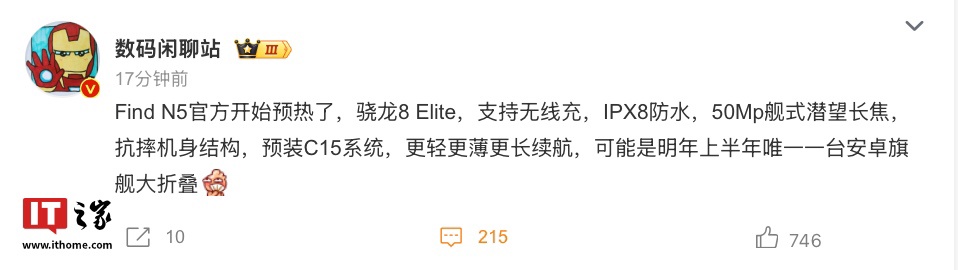 IT之家 12 月 16 日消息,博主 @数码闲聊站 现表示 OPPO Find N5 折叠屏手机现已开启预热,其同时公布了这款手机的部分规格信息。