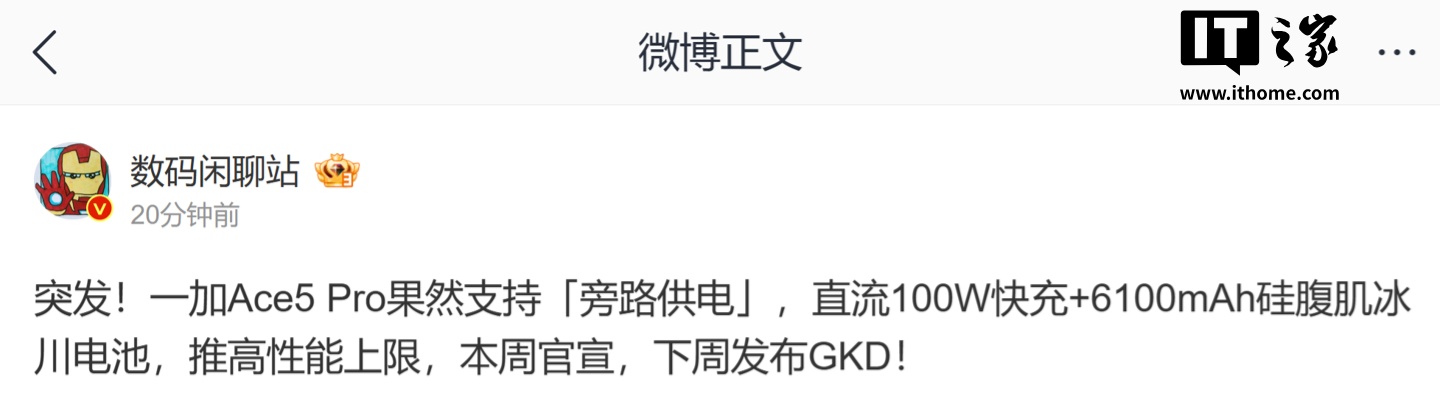 文章来源于互联网:IT之家-消息称一加 Ace 5 Pro 手机支持“旁路供电”,本周官宣下周发布