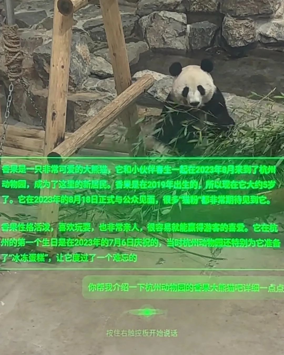 外出游玩的你,在杭州动物园看大熊猫,对着Rokid Glasses说一句:“乐奇,杭州大熊猫的资料。”大熊猫的姓名、年龄、家乡等详细资料直接跃然眼前;