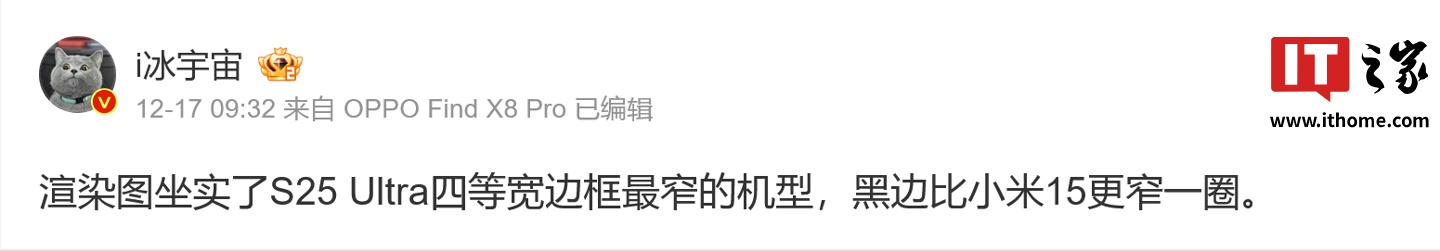 IT之家 12 月 18 日消息,消息源 @i冰宇宙 昨日(12 月 17 日)在 X 平台发布推文,曝料称三星 Galaxy S25 Ultra 手机采用超窄边框设计,黑边比小米 15 更窄一圈。
