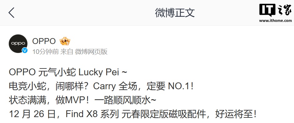 IT之家 12 月 18 日消息,OPPO 连续两日发文,预告 Find X8 系列元春限定版磁吸配件,将于 12 月 26 日发布。
