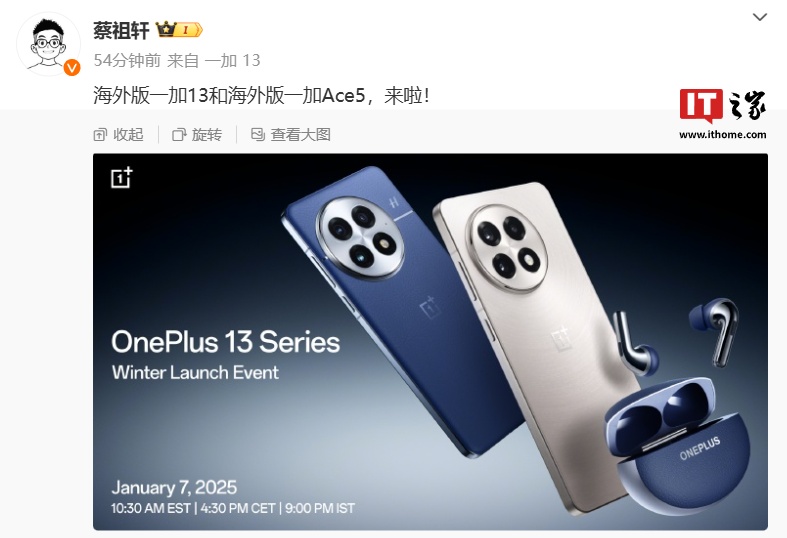 IT之家 12 月 18 日消息,一加员工 @蔡祖轩 今日发文透露,海外版一加 13 和海外版一加 Ace 5 手机将于 2025 年 1 月 7 日发布。