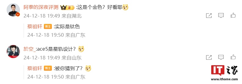 IT之家注意到,@蔡祖轩 公布的图片中出现了一加 Ace 5 手机的外观。他本人还在评论区中回复了部分网友提出的新机相关问题:针对一加 Ace 5 手机的配色是否为金色,他表示“实际是钛色”;针对 Ace 5 是否为星轨设计,他回复“被你猜到了?”