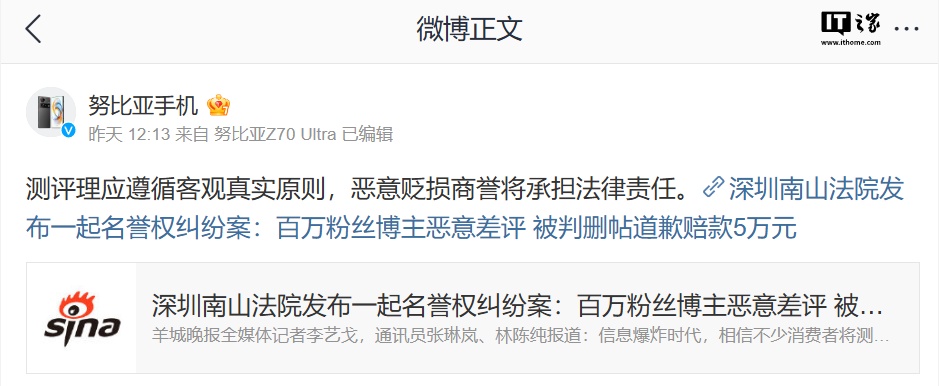IT之家注意到,“努比亚手机”官方微博昨日转发了该报道,并称“测评理应遵循客观真实原则,恶意贬损商誉将承担法律责任。”