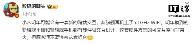 IT之家 12 月 19 日消息,博主 @数码闲聊站 今日爆料称:“小米明年可能会有一套新的跨端交互,新旗舰耳机上了 5.1GHz WIFI,明年摸到的新旗舰平板和新旗舰手机都有硬件级交互设计,这套硬件方案的可交互空间非常大,但愿澎湃不要浪费这套组合”。
