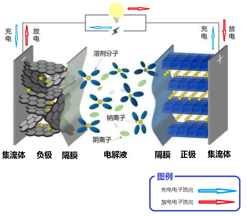 放电状态 钠离子(Na+)从负极材料中脱嵌,经过电解液和隔膜嵌入到正极,使正极处于富钠态,负极处于贫钠态。外电路中电子也随之移动来保持电荷平衡。