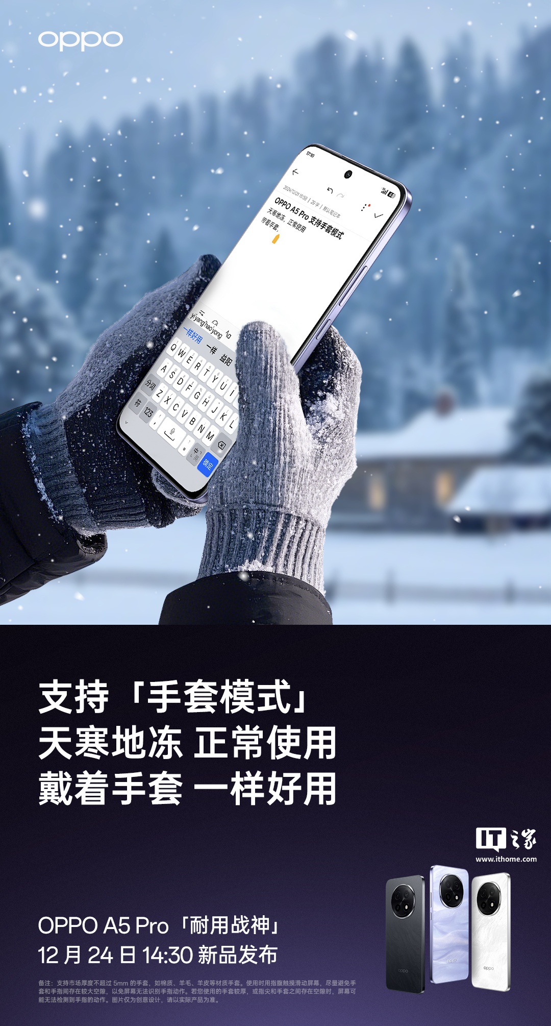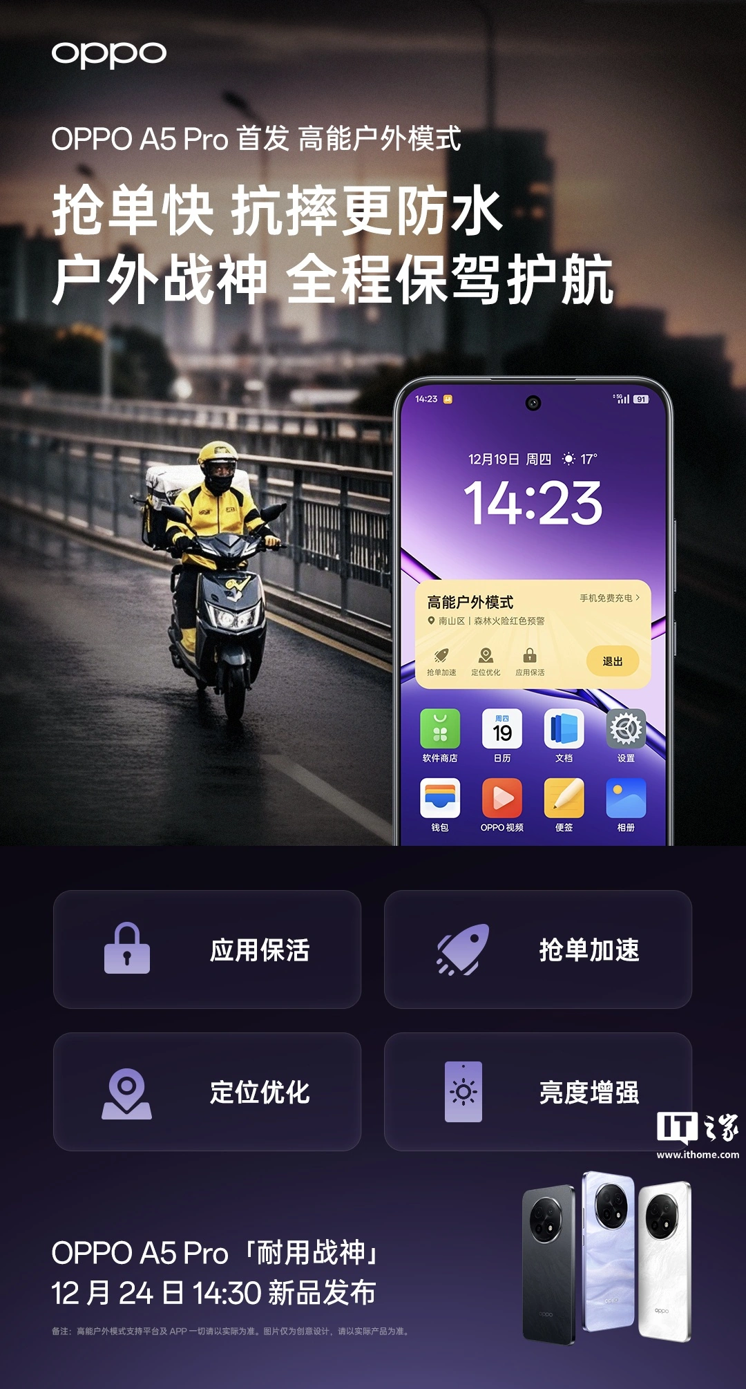 IT之家 12 月 21 日消息,OPPO A5 Pro 手机将于 12 月 24 日 14:30 发布,官方预热称新机首发高能户外模式,支持一键抢单加速、实时定位优化、应用持续保活等。
