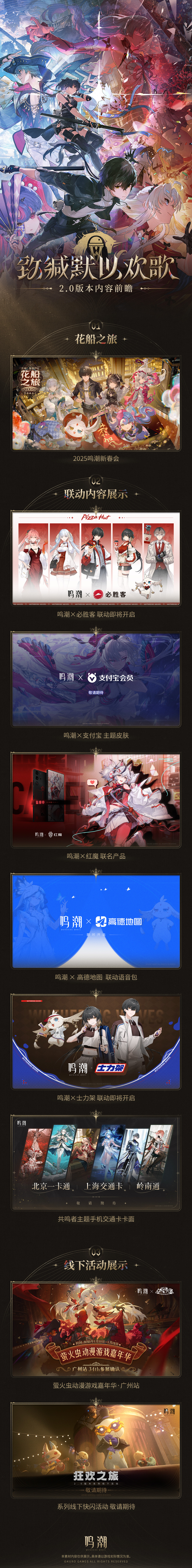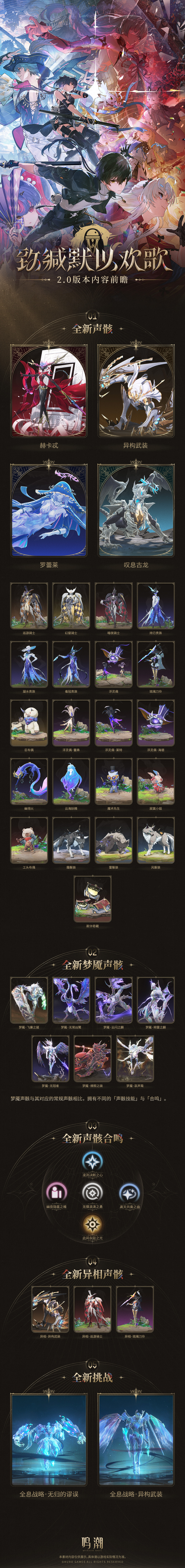 与此同时,《鸣潮》今晚举行前瞻活动,宣布 2.0 版本「致缄默以欢歌」将于 2025 年 1 月 2 日更新,更新内容包括新卡池、新角色、线上直送 440 抽、必胜客联动等等。