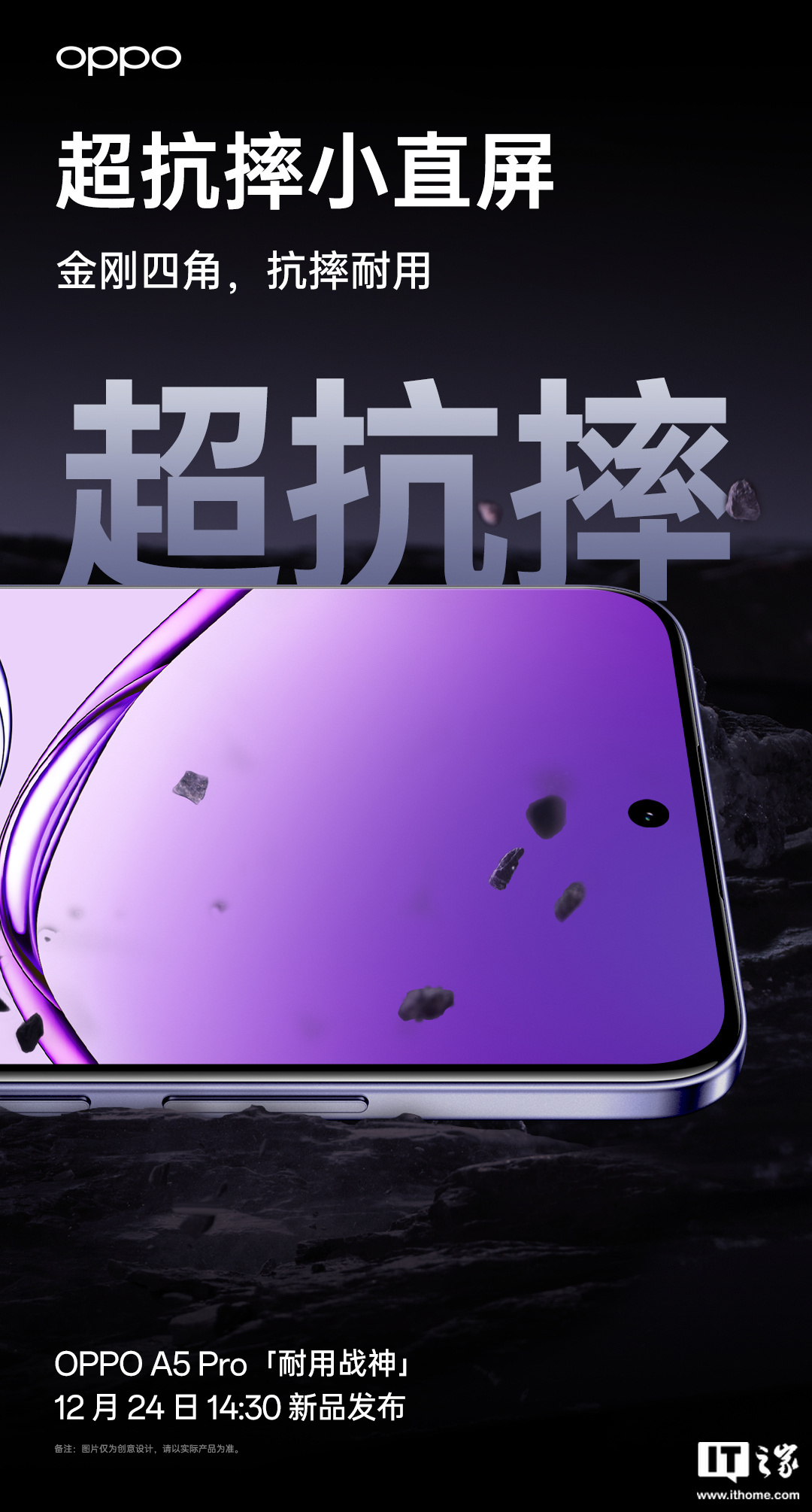 IT之家 12 月 22 日消息,OPPO A5 Pro 手机将于 12 月 24 日 14:30 发布,官方今日继续对这款机型进行预热,号称超抗摔金刚石架构再升级,“做到四曲柔边直屏形态下,前所未有的抗摔性能”。