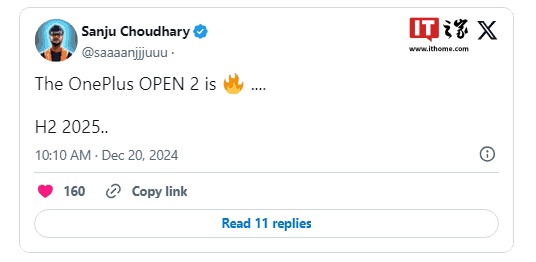 这款手机在海外对应 OPPO OnePlus OPEN 2(一加 OPEN 2)折叠屏手机,消息源 Sanju Choudhary 认为,该机将于 2025 年(明年)第二季度以后在全球推出。