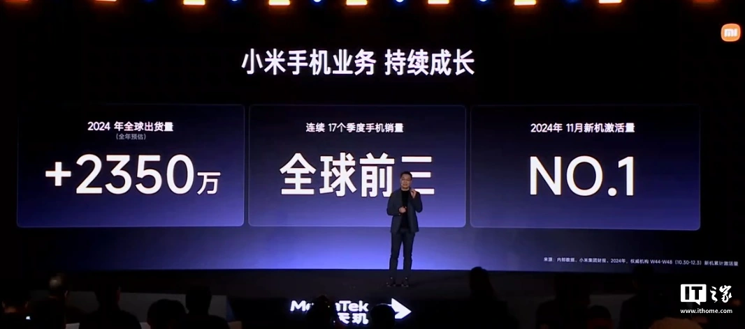 IT之家 12 月 23 日消息,在今日的 2024 MediaTek 天玑芯片新品发布会上,小米集团合伙人、总裁、手机部总裁、小米品牌总经理卢伟冰发表演讲。